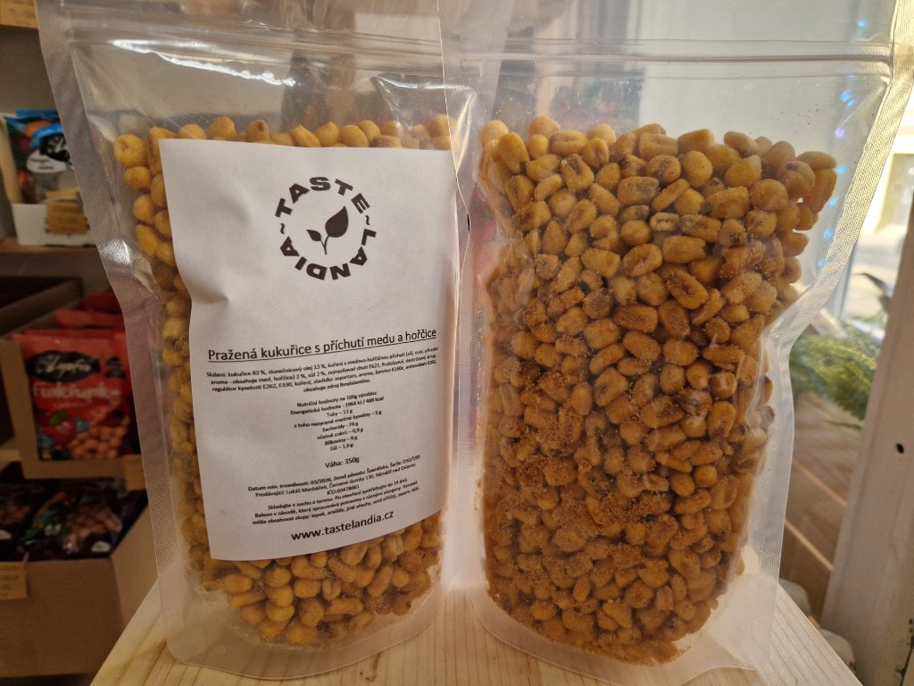 Složení: kukuřice 83 %, slunečnicový olej 13%, koření s medovo-hořčičnou příchutí (sůl, cukr, přírodní aroma - obsahuje med, hořčice) 2%, zvýrazňovač chuti E621, fruktózový, dextrózový sirup, regulátor kyselosti E262, E330, koření, sladidlo: aspartam, aroma, barvivo E160c, antioxidant E392, obsahuje zdroj fenylalantinu